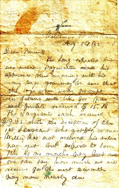 Letter from James to parents, August 8, 1862#