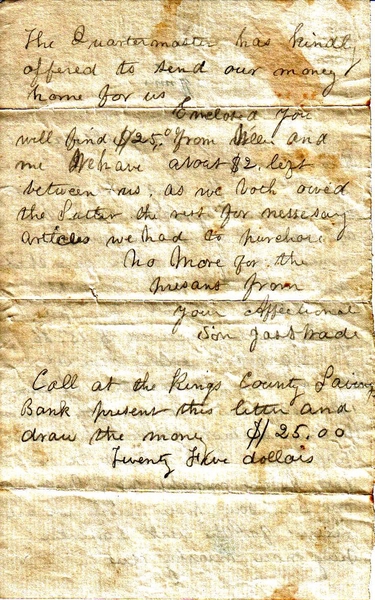 Enclosed you will find $25.00 from Willie and me. We have about $2.00 left between us, as we both owed the sutler the rest for necessary articles we had to purchase.
