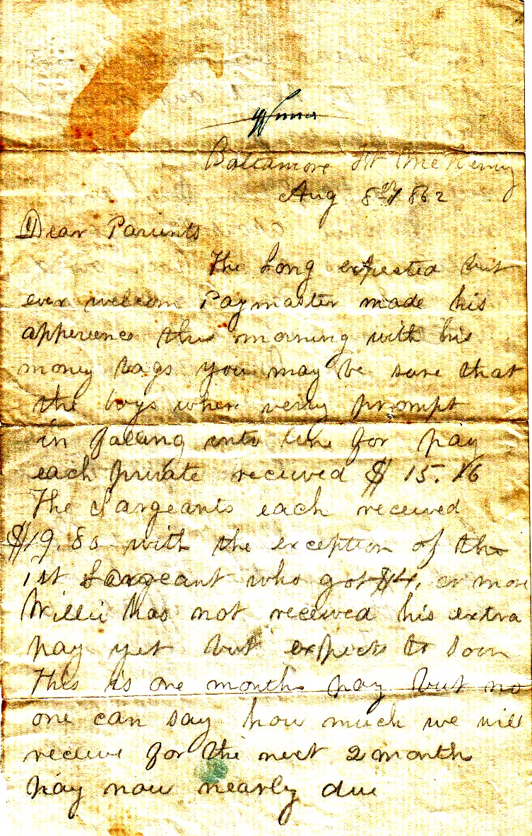 The long expected but ever welcome Paymaster made his appearance this morning with his money bags. You may be sure that the boys were very prompt in falling into line for pay. Each private received $15.16. The Sergeants each received $19.80, with the exception of the 1st Sergeant who got $14.00 more. Willie has not received his extra pay yet but expects to soon. This is one month’s pay but no one can say how much we will receive for the next two months’ pay now nearly due. The Quartermaster has kindly offered to send our money home for us.