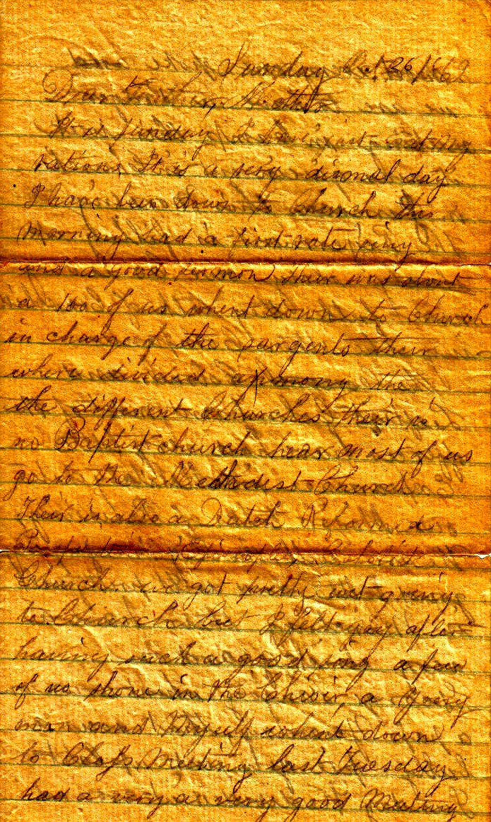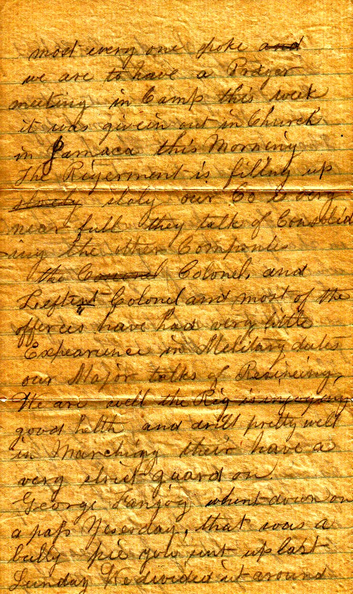 It is Sunday. I have just eaten my rations. It is a very dismal day. I have been down to church this morning and had a first-rate sing and a good sermon. There were about 100 of us who went down to church in charge of one of the sergeants. We were divided among the different churches. There is no Baptist Church here; most of us go to the Methodist Church. There are also Dutch Reformed, Presbyterian, Episcopal, and Catholic churches. We got pretty wet going to church but I felt gay after leaving such a good sing. A few of us shone in the choir. A young man and myself went down to class meeting last Tuesday and had a very good meeting; most every one spoke. We are to have a prayer meeting in camp this week. It was given out in church in Jamaica this morning. The Regiment is filling up slowly. Our Co. is very nearly full. They talk of consolidating the other Companies.