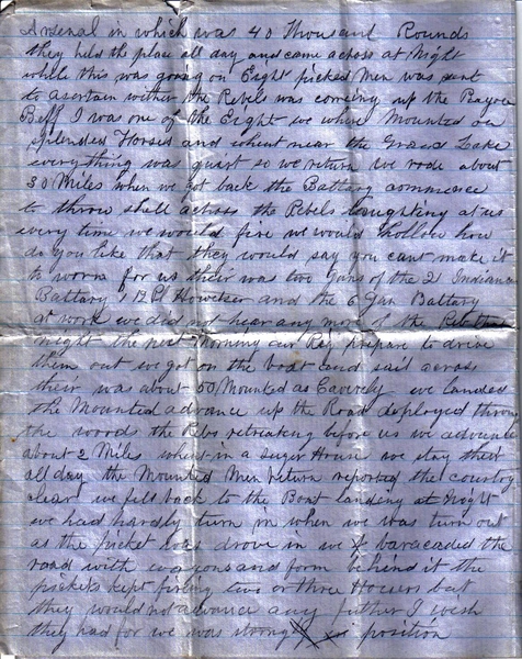 I have just received three letters from you and very glad to hear that you are all well and that Durlyn is promoted. We are both well. In fact, we have not lost a man since we have been out – that is our Company. Co. A has lost seven or eight men. But now to business. Our Regiment has been in action and we have done something for our country. It was like this. Our Regiment was ordered to Brashear City to hold the place while Banks crossed over to Port Hudson. We advanced across the Bay (Berwicks) about four miles, then reversed four or five days, but had to cross over again. Nothing happened for a day or two, but then the Rebs advanced opposite us about 10 o’clock, the Negroes running for dear life. Well, they advanced and fired at the Hospital. Our picket commenced to fire at them. Then a battery of artillery got to work on them, the shells making things lively. The Provost Guard, of which James is a member, advanced across the bay, the Rebs giving them a volley as they landed. They were soon in line of battle and advanced up the road, the Rebels retreating. Up the road, the 23rd Connecticut then crossed and both advancing up the road held the arsenal in which were 40 thousand rounds. They held the place all day and came across at night. While this was going on, eight picked men were sent to ascertain whether the Rebels were coming up the Bayou Boeuf. I was one of the eight. We were mounted on splendid horses and went near the Grand Lake. Everything was quiet, so we returned. We rode about 30 miles. When we got back the battery commenced to throw shells across the Rebels laughing at us. Every time we would fire, we would holler, “How do you like that?” They would say, “You can’t make it too warm for us!” There were two guns of the 21st Indiana battery, one 12-pound howitzer, and the 6-gun battery at work. We did not hear any more of the Rebs that night. The next morning our Regiment prepared to drive them out. We got on the boat and sailed across. There were about 50 mounted as cavalry. We landed the mounted advance up the road and deployed through the woods, the Rebs retreating