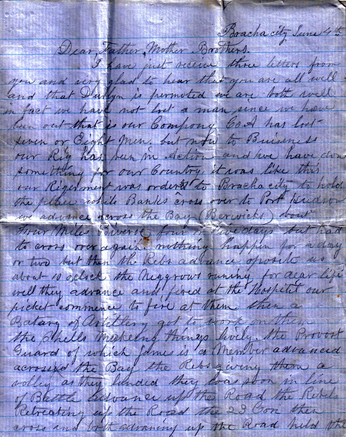 I have just received three letters from you and very glad to hear that you are all well and that Durlyn is promoted. We are both well. In fact, we have not lost a man since we have been out – that is our Company. Co. A has lost seven or eight men. But now to business. Our Regiment has been in action and we have done something for our country. It was like this. Our Regiment was ordered to Brashear City to hold the place while Banks crossed over to Port Hudson. We advanced across the Bay (Berwicks) about four miles, then reversed four or five days, but had to cross over again. Nothing happened for a day or two, but then the Rebs advanced opposite us about 10 o’clock, the Negroes running for dear life. Well, they advanced and fired at the Hospital. Our picket commenced to fire at them. Then a battery of artillery got to work on them, the shells making things lively. The Provost Guard, of which James is a member, advanced across the bay, the Rebs giving them a volley as they landed. They were soon in line of battle and advanced up the road, the Rebels retreating. Up the road, the 23rd Connecticut then crossed and both advancing up the road held the arsenal in which were 40 thousand rounds. They held the place all day and came across at night. While this was going on, eight picked men were sent to ascertain whether the Rebels were coming up the Bayou Boeuf. I was one of the eight. We were mounted on splendid horses and went near the Grand Lake. Everything was quiet, so we returned. We rode about 30 miles. When we got back the battery commenced to throw shells across the Rebels laughing at us. Every time we would fire, we would holler, “How do you like that?” They would say, “You can’t make it too warm for us!” There were two guns of the 21st Indiana battery, one 12-pound howitzer, and the 6-gun battery at work. We did not hear any more of the Rebs that night. The next morning our Regiment prepared to drive them out. We got on the boat and sailed across. There were about 50 mounted as cavalry. We landed the mounted advance up the road and deployed through the woods, the Rebs retreating