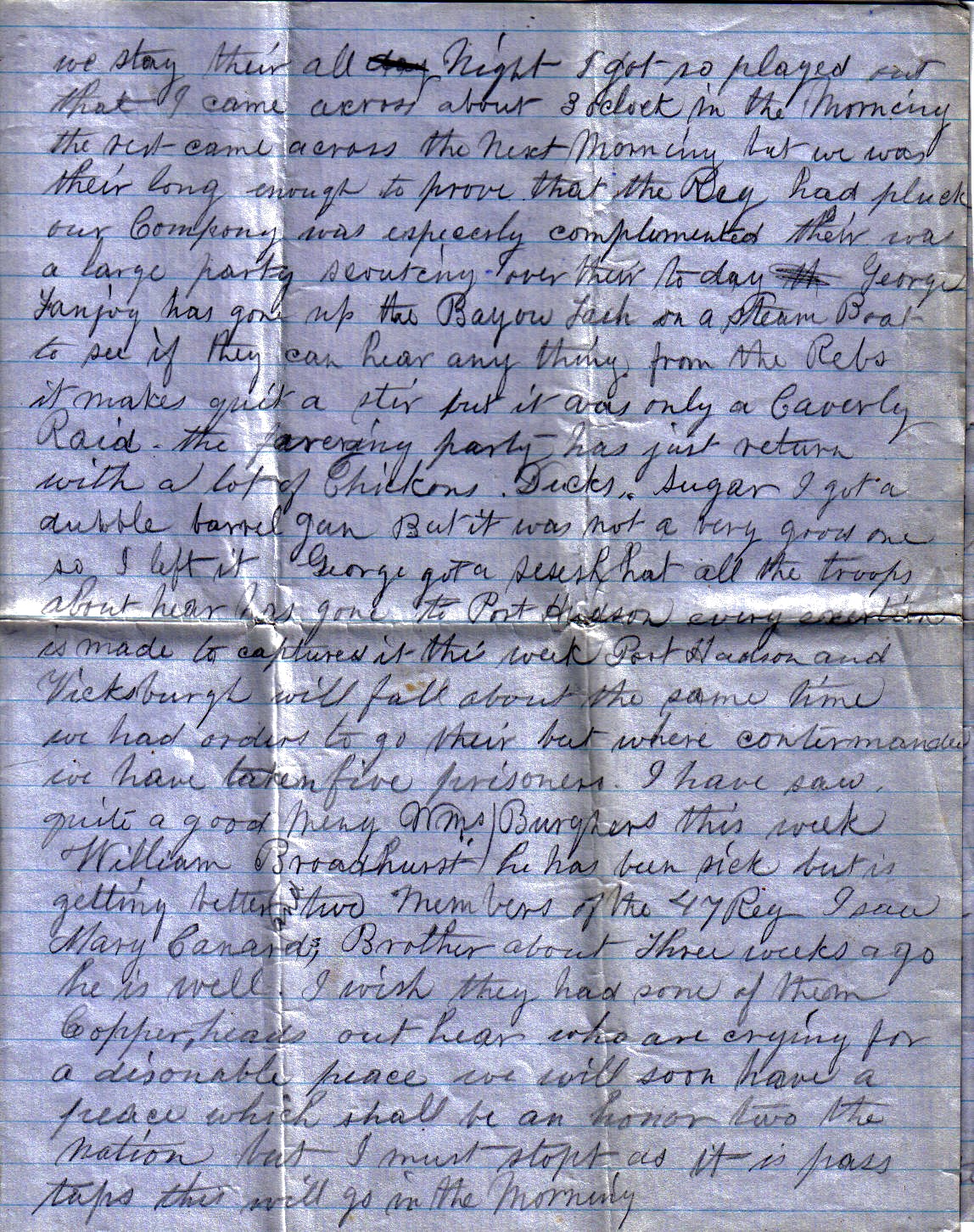 before us. We advanced about two miles and went in a sugar house. We stayed there all day. The mounted men returned, reporting the country clear. We fell back to the boat, landing at night. We had hardly turned in when we were turned out as the picket was driven in. We barricaded the road with wagons and formed behind them. The pickets kept firing two or three hours but the Rebs would not advance any further. I wish they had for we were in a strong position. We stayed there all night. I got so played out that I came across about 3 o’clock in the morning. The Rebs came across the next morning but we were there long enough to prove that the Regiment has pluck. Our company was especially complemented. There was a large party scouting over there today. George Fanjoy has gone up the Bayou Lash on a steamboat to see if they can hear anything from the Rebs. It made quite a stir but it was only a cavalry raid. The scouting party has just returned with a lot of chickens, ducks, and sugar. I got a double barrel gun, but it was not a very good one so I left it. George got a Secesh hat. All the troops about here have gone to Port Hudson. Every exertion is being made to capture it this week. Port Hudson and Vicksburg will fall about the same time. We had orders to go there but they were countermanded. We have taken five prisoners. I have seen a good many Wmsburghers this week. William Broadhurst has been sick but is getting better and two members of the 47th Regt. I saw Mary Canard’s brother about three weeks ago; he is well. I wish they had some of them Copperheads out here who are crying for a dishonorable peace. We will soon have a peace that will be an honor to the nation, but I must stop now as it is past Taps. This will go on in the morning.