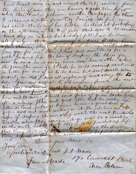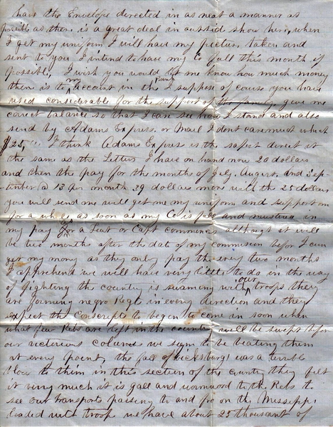 I received two welcome letters from home today. I am glad to hear that all are doing well and prospering at home. Your hopes and expectations to our coming home soon are, I am sorry to say, doomed to be blasted, as has been decided upon by the officials here to keep the three year men, among which are Will and myself, the time of the nine months. Men in our Regiment will be out on the 10th of October when they will be sent home. There is a rare possibility of them not keeping the three year men on account of there being so few of them. We will know for certain in a month. I believe it is the design of the Major, after sending home the nine month men, to fill out the Regiment with drafted men. I, myself, will soon dissolve all connection with the Regiment; that is, I have a pretty good prospect – the case stands this way: And to make it short and sweet I am going to be a Captain or Lieutenant, I don’t know which yet, in a Negro Regiment, the 16th Corps d’Afrique. I have a pretty fair prospect of success. I have just returned from a recruiting expedition up the country, when two months ago I was a miserable prisoner. It would have done you good to see me bully the planters. I got out at Terre Bonne Station and went into the first plantation and demanded a good horse and saddle, and wanted it in a hurry too. The Planter, one Overseer, and two sons all came in a body to expostulate and argue the point with me. I remembered my suffering some two months previous in the country and got wroth and told them I did not want any argument, just a horse and saddle and that very sudden too. I said to a nig – there was about a dozen standing around showing their ivories, stretching their mouths from ear to ear – saddle up the best horse on the place and bring him to me. I mounted my steed and then commenced to review them. Then there was a row; the Planter thought, as a high handed proceeding, taking his hands from him that had cost him so much money from 700 to a thousand dollars a piece, but I had my papers from the General and they had to submit. The military is all powerful here, what they say is law and the command of a soldier has to be obeyed, providing of course, it is in conformity with General orders. Fifty men constitute a company of Black soldiers, and myself with two others stand a fair chance of raising, in which case I intend going as a Captain it is the only alternative to serve two years as a Private, or get a commission, when after awhile I can probably resign. The pay is something over $100 a month and I would like to make enough to send me through college if possible as well as support the family. I am having a first rate time. At present, I have furnished rooms at 170 Commandelett Street, New Orleans, where in the future you may direct my letters. Direct them for the present, until you hear further from me, to Lieut. J.S. Wade, and please have the envelope directed in as neat a manner as possible, as there is a great deal in outside show here. When I get my uniform I will have my picture taken and sent to you. I intend to have my company full this month if possible. I wish you would let me know how much money there is in my account, in the point I suppose, of course, you have used considerable for the support of the family. Give me correct balance so that I can see how I stand and also send by Adams Express or mail, I don’t care much of which, twenty-five dollars. I think Adams Express is the safest. Direct it the same as the letters, I have on hand now twenty dollars and then the pay for the months of July, August, and September at thirteen per month, thirty-nine dollars more with the twenty-five dollars you will send me, will get me my uniform and support me for awhile. As soon as my Company is full and mustered in my pay as a Lieutenant or Captain commences, although it will be two months after the date of my commission before I can get my money, as they only pay every two months, I apprehend we will have very little to do in the way of fighting. The country is swarming with our troops, they are forming Negro Regiments in every direction and they expect the conscripts to begin to come in soon; when what Rebels are left in the country will be swept before our victorious columns. We seem to be beating them at every front, the fall of Vicksburg was a terrible blow to them in this section of the country, they felt it very much. It is gall and wormwood to the Rebels to see our transports passing to and fro on the Mississippi loaded with troops. We have about twenty-five thousand of General Grant’s men in and around the city resting from the toils of war. They are having a good time of it, while their General is planning another campaign for them. I received a letter from Cousin Louise, she feels very bad about the loss of her brother. He died at Vicksburg on the afternoon of the Fourth of July, that ever-to-be-remembered day on which Vicksburg fell. I am drilling a Company of negroes that will revenge his death, if the have a fair chance. They complain of not having read a letter from you for some time. I have not seen Will for two weeks; he won’t like the idea of keeping the three-year men. He said he is going home, but don’t waste any anxiety on me; I am still alright, only send along the twenty-five dollars. Give my respects to all inquiring friends. The next time you see me it will be in a Captain’s uniform. I would like to hear from Father. I hope his health is good, tell him not to worry; I will send piles of green-backs home after awhile. John writes good letters but he makes his letters so loud, so large; I mean he uses a great deal of paper and not much writing on it. The rebels here are in hopes of keeping the war along until the next Presidential Elections when they imagine there will be a reaction in the North, but I think they will be finished up before that time. That is if we will only enforce the draft, everything depends on that our armies must be 