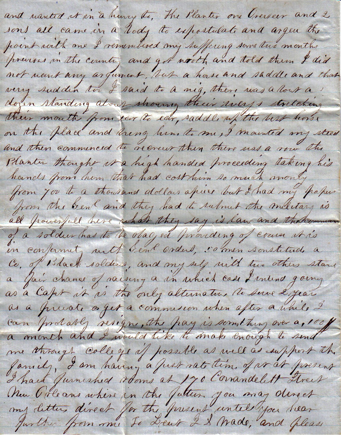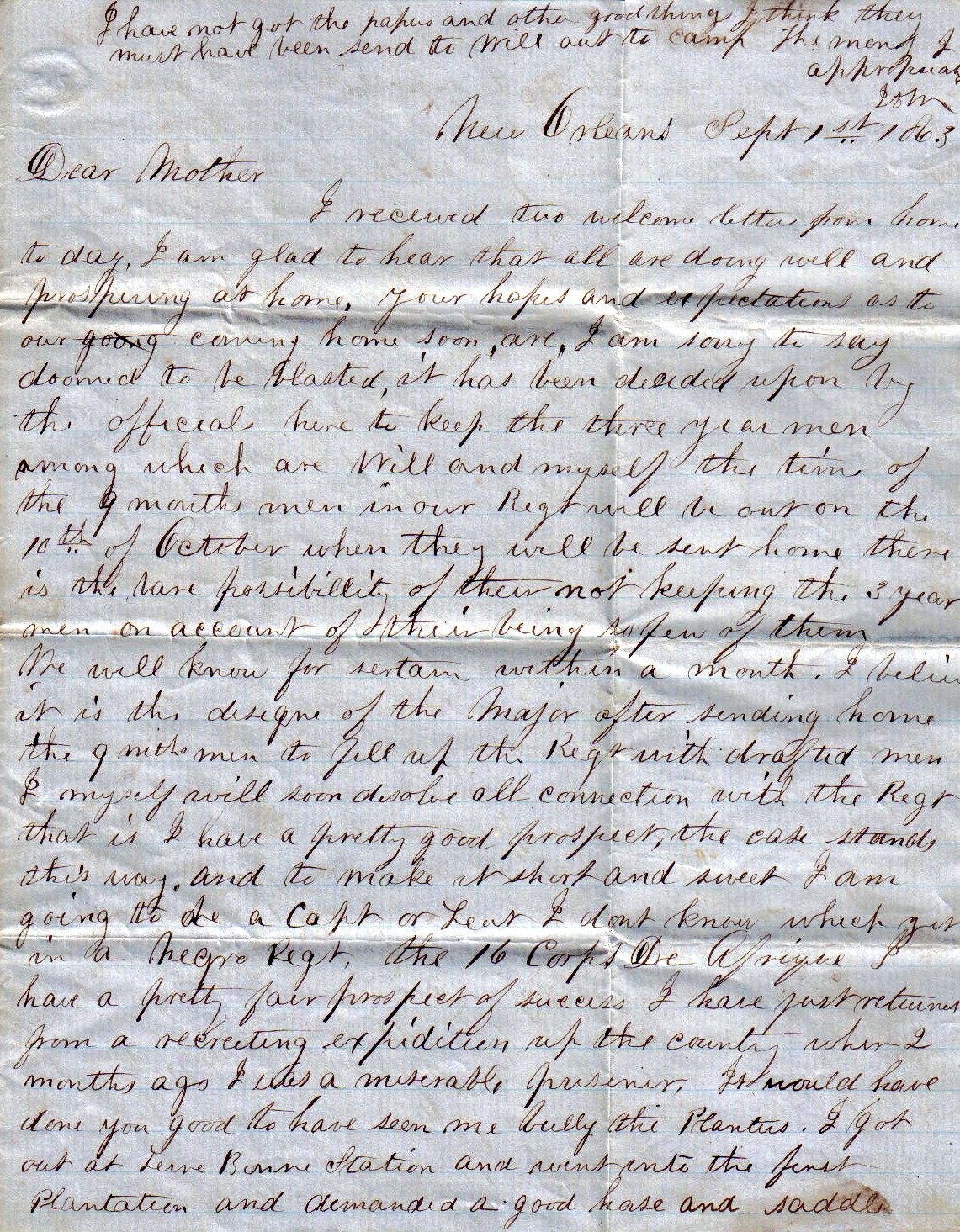 I received two welcome letters from home today. I am glad to hear that all are doing well and prospering at home. Your hopes and expectations to our coming home soon are, I am sorry to say, doomed to be blasted, as has been decided upon by the officials here to keep the three year men, among which are Will and myself, the time of the nine months. Men in our Regiment will be out on the 10th of October when they will be sent home. There is a rare possibility of them not keeping the three year men on account of there being so few of them. We will know for certain in a month. I believe it is the design of the Major, after sending home the nine month men, to fill out the Regiment with drafted men. I, myself, will soon dissolve all connection with the Regiment; that is, I have a pretty good prospect – the case stands this way: And to make it short and sweet I am going to be a Captain or Lieutenant, I don’t know which yet, in a Negro Regiment, the 16th Corps d’Afrique. I have a pretty fair prospect of success. I have just returned from a recruiting expedition up the country, when two months ago I was a miserable prisoner. It would have done you good to see me bully the planters. I got out at Terre Bonne Station and went into the first plantation and demanded a good horse and saddle, and wanted it in a hurry too. The Planter, one Overseer, and two sons all came in a body to expostulate and argue the point with me. I remembered my suffering some two months previous in the country and got wroth and told them I did not want any argument, just a horse and saddle and that very sudden too. I said to a nig – there was about a dozen standing around showing their ivories, stretching their mouths from ear to ear – saddle up the best horse on the place and bring him to me. I mounted my steed and then commenced to review them. Then there was a row; the Planter thought, as a high handed proceeding, taking his hands from him that had cost him so much money from 700 to a thousand dollars a piece, but I had my papers from the General and they had to submit. The military is all powerful here, what they say is law and the command of a soldier has to be obeyed, providing of course, it is in conformity with General orders. Fifty men constitute a company of Black soldiers, and myself with two others stand a fair chance of raising, in which case I intend going as a Captain it is the only alternative to serve two years as a Private, or get a commission, when after awhile I can probably resign. The pay is something over $100 a month and I would like to make enough to send me through college if possible as well as support the family. I am having a first rate time. At present, I have furnished rooms at 170 Commandelett Street, New Orleans, where in the future you may direct my letters. Direct them for the present, until you hear further from me, to Lieut. J.S. Wade, and please have the envelope directed in as neat a manner as possible, as there is a great deal in outside show here. When I get my uniform I will have my picture taken and sent to you. I intend to have my company full this month if possible. I wish you would let me know how much money there is in my account, in the point I suppose, of course, you have used considerable for the support of the family. Give me correct balance so that I can see how I stand and also send by Adams Express or mail, I don’t care much of which, twenty-five dollars. I think Adams Express is the safest. Direct it the same as the letters, I have on hand now twenty dollars and then the pay for the months of July, August, and September at thirteen per month, thirty-nine dollars more with the twenty-five dollars you will send me, will get me my uniform and support me for awhile. As soon as my Company is full and mustered in my pay as a Lieutenant or Captain commences, although it will be two months after the date of my commission before I can get my money, as they only pay every two months, I apprehend we will have very little to do in the way of fighting. The country is swarming with our troops, they are forming Negro Regiments in every direction and they expect the conscripts to begin to come in soon; when what Rebels are left in the country will be swept before our victorious columns. We seem to be beating them at every front, the fall of Vicksburg was a terrible blow to them in this section of the country, they felt it very much. It is gall and wormwood to the Rebels to see our transports passing to and fro on the Mississippi loaded with troops. We have about twenty-five thousand of General Grant’s men in and around the city resting from the toils of war. They are having a good time of it, while their General is planning another campaign for them. I received a letter from Cousin Louise, she feels very bad about the loss of her brother. He died at Vicksburg on the afternoon of the Fourth of July, that ever-to-be-remembered day on which Vicksburg fell. I am drilling a Company of negroes that will revenge his death, if the have a fair chance. They complain of not having read a letter from you for some time. I have not seen Will for two weeks; he won’t like the idea of keeping the three-year men. He said he is going home, but don’t waste any anxiety on me; I am still alright, only send along the twenty-five dollars. Give my respects to all inquiring friends. The next time you see me it will be in a Captain’s uniform. I would like to hear from Father. I hope his health is good, tell him not to worry; I will send piles of green-backs home after awhile. John writes good letters but he makes his letters so loud, so large; I mean he uses a great deal of paper and not much writing on it. The rebels here are in hopes of keeping the war along until the next Presidential Elections when they imagine there will be a reaction in the North, but I think they will be finished up before that time. That is if we will only enforce the draft, everything depends on that our armies must be 