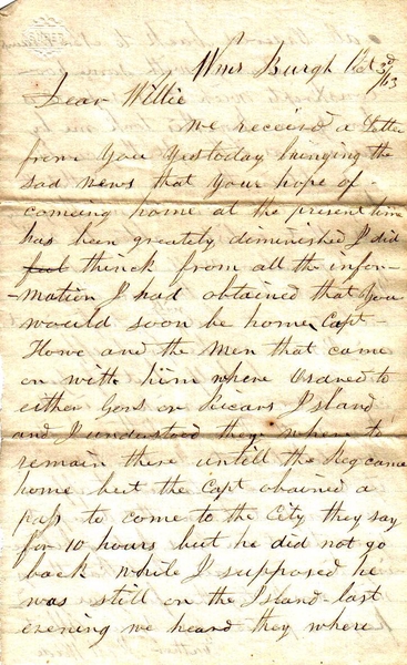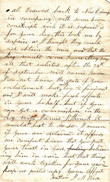 We received a letter from you yesterday bringing the sad news that your hope of coming home at the present time has been greatly diminished. I did think from all the information I had obtained that you would soon be home. Capt. Howe and the men that came on with him were ordered to either Jersey or Rikers Island and I understand they were to remain there until the Regt. came home; but the Capt. obtained a pass to come to the City, they say for 10 hours, but he did not go back. While I supposed he was still on the Island last evening, we heard they were all ordered back to New Orleans in company with some 600- conscripts which are supposed from your Regt. This took me by surprise as I thought they could not obtain the men and that the Regt. would come home. They say all that enlisted after the 24th of September will come home. I do not know the date of your enlistment but will try to find out and I will make fresh efforts in your behalf. But if you can get a commission in the Regt. with James, I think it would be best to do so. I mean, if you are detained, it affords me comfort know that you put your trust in God, feeling that believing Him in vain but that things will work together for your good – Keep us posted up,