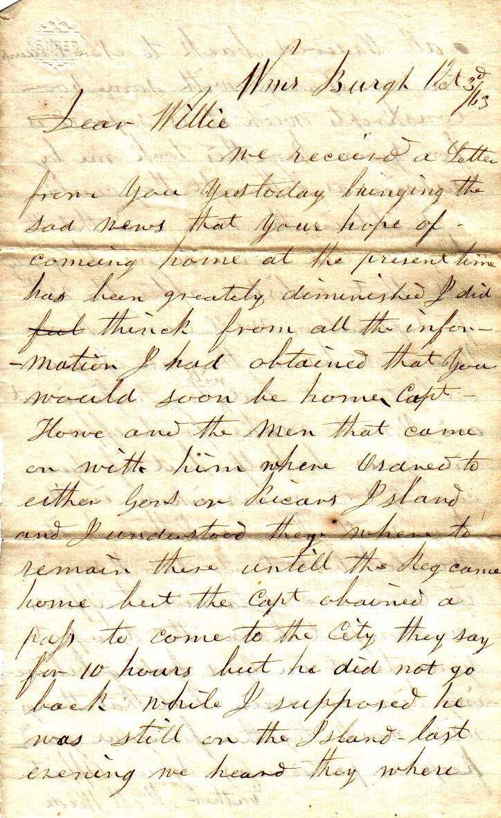 We received a letter from you yesterday bringing the sad news that your hope of coming home at the present time has been greatly diminished. I did think from all the information I had obtained that you would soon be home. Capt. Howe and the men that came on with him were ordered to either Jersey or Rikers Island and I understand they were to remain there until the Regt. came home; but the Capt. obtained a pass to come to the City, they say for 10 hours, but he did not go back. While I supposed he was still on the Island last evening, we heard they were all ordered back to New Orleans in company with some 600- conscripts which are supposed from your Regt. This took me by surprise as I thought they could not obtain the men and that the Regt. would come home. They say all that enlisted after the 24th of September will come home. I do not know the date of your enlistment but will try to find out and I will make fresh efforts in your behalf. But if you can get a commission in the Regt. with James, I think it would be best to do so. I mean, if you are detained, it affords me comfort know that you put your trust in God, feeling that believing Him in vain but that things will work together for your good – Keep us posted up,