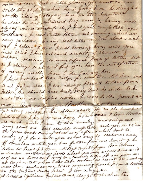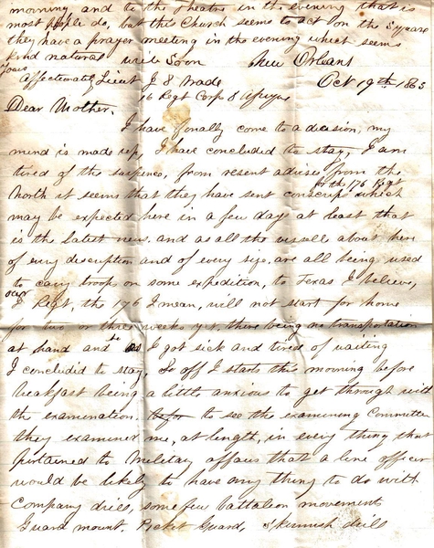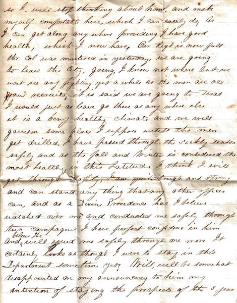 Our regiment is now full, the Colonel was mustered in yesterday; we are going to leave the City, going I know not where, but we won’t see any fighting yet a while as the men are all new recruits. It is said we are going to Texas. I would just as leave as go there as anywhere else; it is a very healthy climate and now we will garrison some place I suppose until the men get drilled. I have passed through the sickly season safely and as the fall and winter are considered the most healthy in this Latitude, I think I will get through safely. I am quite tough and strong and can stand anything that any other officers can, and as a Divine Providence has I believe watched over me and conducted me safely through two campaigns. I have perfect confidence in Him and believe He will guard me safely through one more. It certainly looks as though I were to stay in this Department some time yet. Will will be somewhat disappointed on my announcing to him of my intention of staying; the prospects of the three-year men certainly look a little gloomy, you can’t convince Will though, but what he is going home; he laughs at the idea of staying here in this Department. He said he has soldiered long enough, having made up my mind what to do; I feel quite comfortable now and contented. I read Father’s letter this morning which was very welcome; in my last letter written about last week ago I believe I said I was coming home, well you will think I have not much stability of character I suppose, receiving so many different kinds of letters, but as I always write as I feel you have the satisfaction of knowing exactly how I do feel. Anyhow, I have not heard from Durlyn for sometime, let him write and John also. I am always pleased to hear from Father, he should have been a Brigadier General, he writes like a solider, no surplus of words. He came to the point at once. And as for you, Mother, why I could not get along without your letters at all; you are the principal inducement to come home. I never knew I loved Mother so much until I came to this country. Now don’t go and worry about me, keep yourself comfortable and you will see the green backs coming that way after