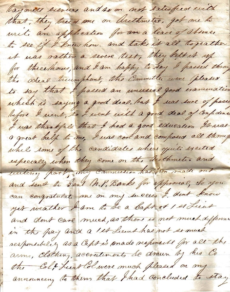 I have finally come to a decision, my mind is made up; I have concluded to stay. I am tired of the suspense. From recent advises from the North, it seems that they have sent conscripts for the 176th Regiment, which may be expected here in a few days – at least that is the latest news. And as all the vessels about here of every description and of every size, are all being used to carry troops on some expedition, to Texas I believe, our Regiment, the 176th I mean, will not start for home for two or three weeks; yes, there being no transportation at hand and as I got sick and tired of waiting, I concluded to stay. So off I start this morning before breakfast being a little anxious to get through with the examination, to see the examining committee. They examined me, at length, in everything that pertained to military affairs that a line officer would be likely to have anything to do with company drill, some few battalion movements guard mount, Picket Guard, skirmish drill, bayonet exercise and so on. Not satisfied with that, they tried me on Arithmetic, got me to write an application for a leave of absence to see if I know how, and taken all together it was rather a severe test. They kept it up for three hours, and I am happy to say I passed the ordeal triumphant. The Committee were pleased to say that I passed an unusual good examination, which is saying a good deal. But I was sure of passing before I went, so I went with a good deal of confidence; I was thankful I had a good education. It was a great help to me; I was cool and composed all through, while some of the candidates were quite excited, especially when they came on the Arithmetic and writing part. My commission has made out and sent to General N.P. Banks for approval, so you can congratulate me on my success. I don’t know yet whether I am to be a Captain or Lieutenant, and don’t care much, as there is not much difference in the pay and 1st Lieutenant has not so much responsibility, as a Captain is made responsible for all the arms, clothing, accoutrements drawn by his company. The Colonel and Lieutenant Colonel were much pleased on my announcing to them that I