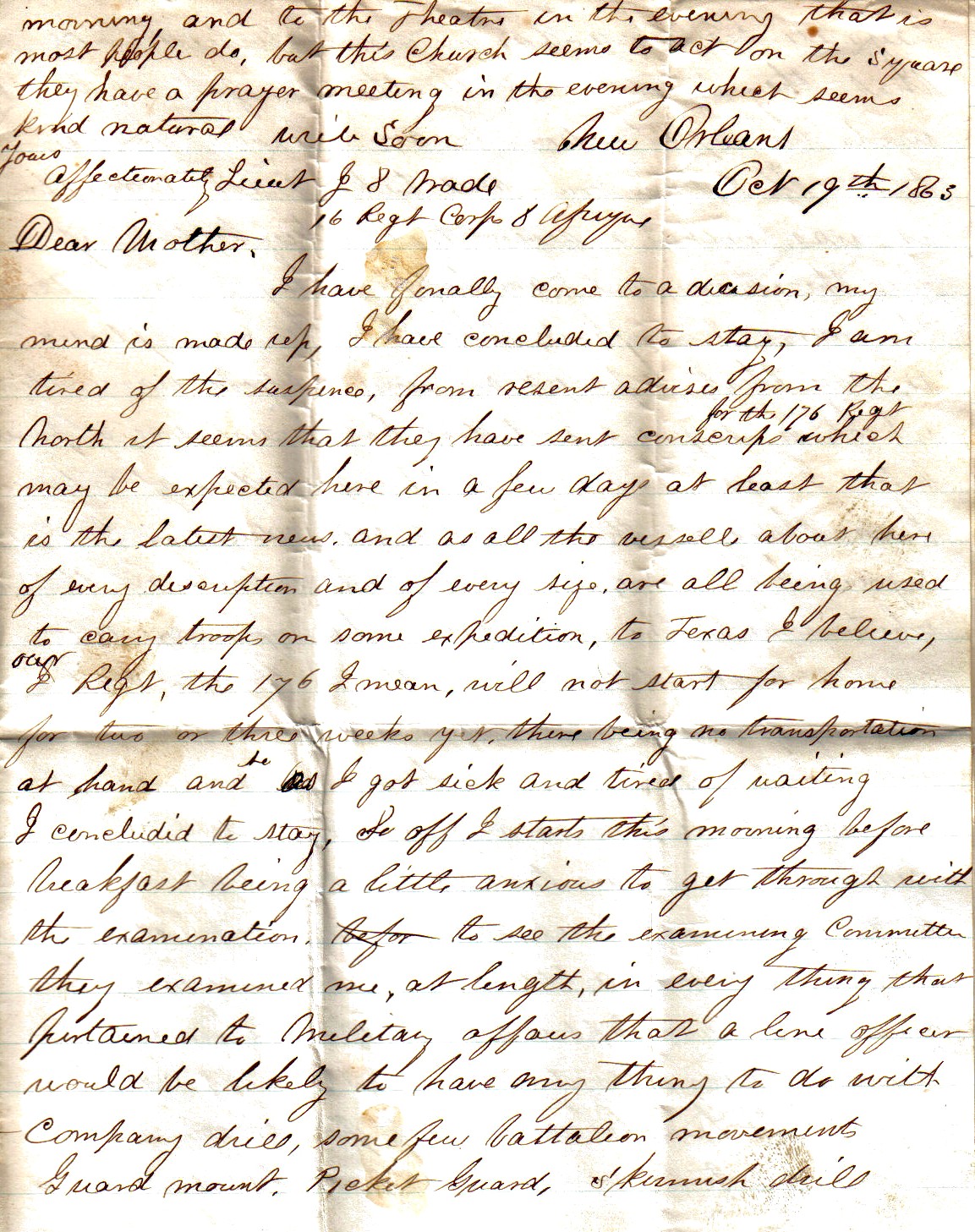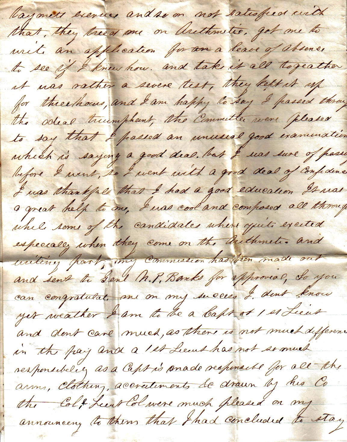 I have finally come to a decision, my mind is made up; I have concluded to stay. I am tired of the suspense. From recent advises from the North, it seems that they have sent conscripts for the 176th Regiment, which may be expected here in a few days – at least that is the latest news. And as all the vessels about here of every description and of every size, are all being used to carry troops on some expedition, to Texas I believe, our Regiment, the 176th I mean, will not start for home for two or three weeks; yes, there being no transportation at hand and as I got sick and tired of waiting, I concluded to stay. So off I start this morning before breakfast being a little anxious to get through with the examination, to see the examining committee. They examined me, at length, in everything that pertained to military affairs that a line officer would be likely to have anything to do with company drill, some few battalion movements guard mount, Picket Guard, skirmish drill, bayonet exercise and so on. Not satisfied with that, they tried me on Arithmetic, got me to write an application for a leave of absence to see if I know how, and taken all together it was rather a severe test. They kept it up for three hours, and I am happy to say I passed the ordeal triumphant. The Committee were pleased to say that I passed an unusual good examination, which is saying a good deal. But I was sure of passing before I went, so I went with a good deal of confidence; I was thankful I had a good education. It was a great help to me; I was cool and composed all through, while some of the candidates were quite excited, especially when they came on the Arithmetic and writing part. My commission has made out and sent to General N.P. Banks for approval, so you can congratulate me on my success. I don’t know yet whether I am to be a Captain or Lieutenant, and don’t care much, as there is not much difference in the pay and 1st Lieutenant has not so much responsibility, as a Captain is made responsible for all the arms, clothing, accoutrements drawn by his company. The Colonel and Lieutenant Colonel were much pleased on my announcing to them that I