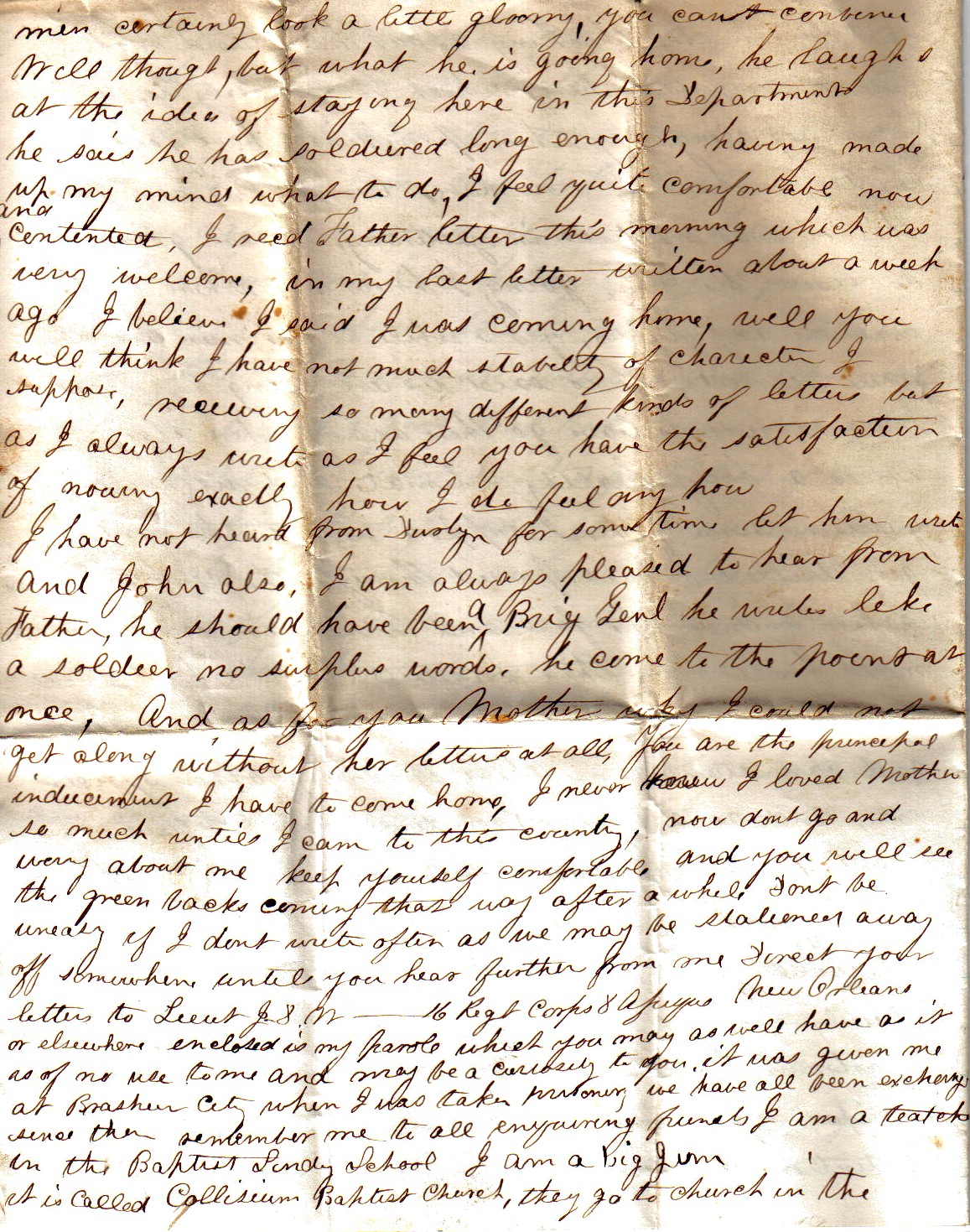 awhile. Don’t be uneasy if I don’t write often, as we may be stationed away off somewhere until you hear further from me. Direct your letters to Lieutenant J.D. Wade, 16th Regiment Corps d’Afrique, New Orleans, or elsewhere. Enclosed is my parole, which you may as well have as it is of no use to me and may be a curiosity to you. It was given me at Brashear City when I was taken prisoner; we have all been exchanged since then. Remember me to all enquiring friends. I am a teacher in the Baptist Sunday School; I am a big gun. It is called Coliseum Baptist Church, they go to church in the morning and to the Theatre in the evening, that is most people do, but this Church seems to act for the square; they have a prayer meeting in the evening which seems kind of natural. Write soon,