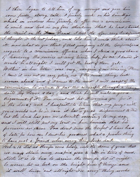 I have been on picket for three days and came in yesterday. While on picket George Fanjoy came out to see me, bringing three letters, two from you and one from Jamaica. Your first letter speaks of your going to Riker’s Island to see Curner and it was very near certain of the conscripts coming. You speak of the conversation you had with Capt. Howe. I expect that those women that were with you must have given him a good talking to. You say he tries to exonerate the officers of the Regiment in the three-year affair. I don’t think the government would have known that there were any three-year men in the Regiment if the officers did not take particular pains to let them know it. Well, it is very evident that the conscripts are coming but I don’t think the Major has received any orders to hold the three-year men. Your note of the Ninth saying the Major was to receive a letter which would be the means of my discharge was received on the same mail as soon as I came in from picket. I went to see him. He said he had received the letter from Mark Hoit requesting the discharges of James and myself. He said the power did not lay with him of giving discharges. I had a long talk with him. He said he would do all he could for me. He said I had always done my duty as a soldier and a gentleman. I then began to tell him of my wrongs and gave him some pretty strong talk. I finally worked on his sympathies which induced him finally to offer me a commission. He smiled and looked in my face thinking he had struck the nail on the head. I took the offer very indifferently. I thought it the best policy and told him I would think about it. Now what do you think of that – jumping all the corporals and sergeants – to be a commissioned officer when I stand a good chance of leaving the service at any time? Bully for me! I know it would be all right. I will get the best of them yet. Mother in her letter was very sanguine about our coming home. I knew it was not so easy getting out of the service. Things look certain ahead and if it comes to the worst I will accept the commission. He intends to put the conscripts through a heavy drill of six