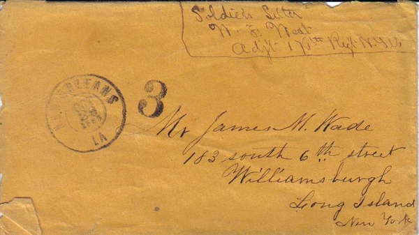 I will now write a few more lines in my letter. There has been quite an excitement in camp this week. The conscripts have arrived in camp. I saw Curner & Coxson and got those handkerchiefs. They smelled very sweet. They said that you’d been there on the Island and you look well. I gave one of them to James who was up to see me. He has passed a brilliant examination and expects to get his commission right away. He looks well. His Regiment is on board the transport. I believe he is going to Texas. He managed to stay behind to make sure of his commission. Our Regiment has not started yet but expects to start any day. The expedition takes all the transports they can get. That’s what detains the Regiment. It is very near certain that the three-year men will be kept, but yet I think it will turn out all right for me. I am not discouraged and will try to get my commission as soon as the Regiment leaves. I think there will be quite a time when they separate the Regt. They are drilling the conscripts four hours a day. I am enjoying good health and putting my trust in the Lord. George and I are both writing. The men are standing around the fires talking. The Major must have had influential friends to have kept the Regt and gotten the conscripts but God will judge his acts. I will still do my duty and try to live a Christian life and I know things will work around all right. I will not have to remind you to pray for me for I know that you have been praying for me. Have faith and they will yet be answered. Tell Durlyn that I am pleased that he is getting along with his studies and John that he must not get the War Fever and enlist. I am glad that he is not in the army. Give my respects to all inquiring friends and I remain your affectionate son,