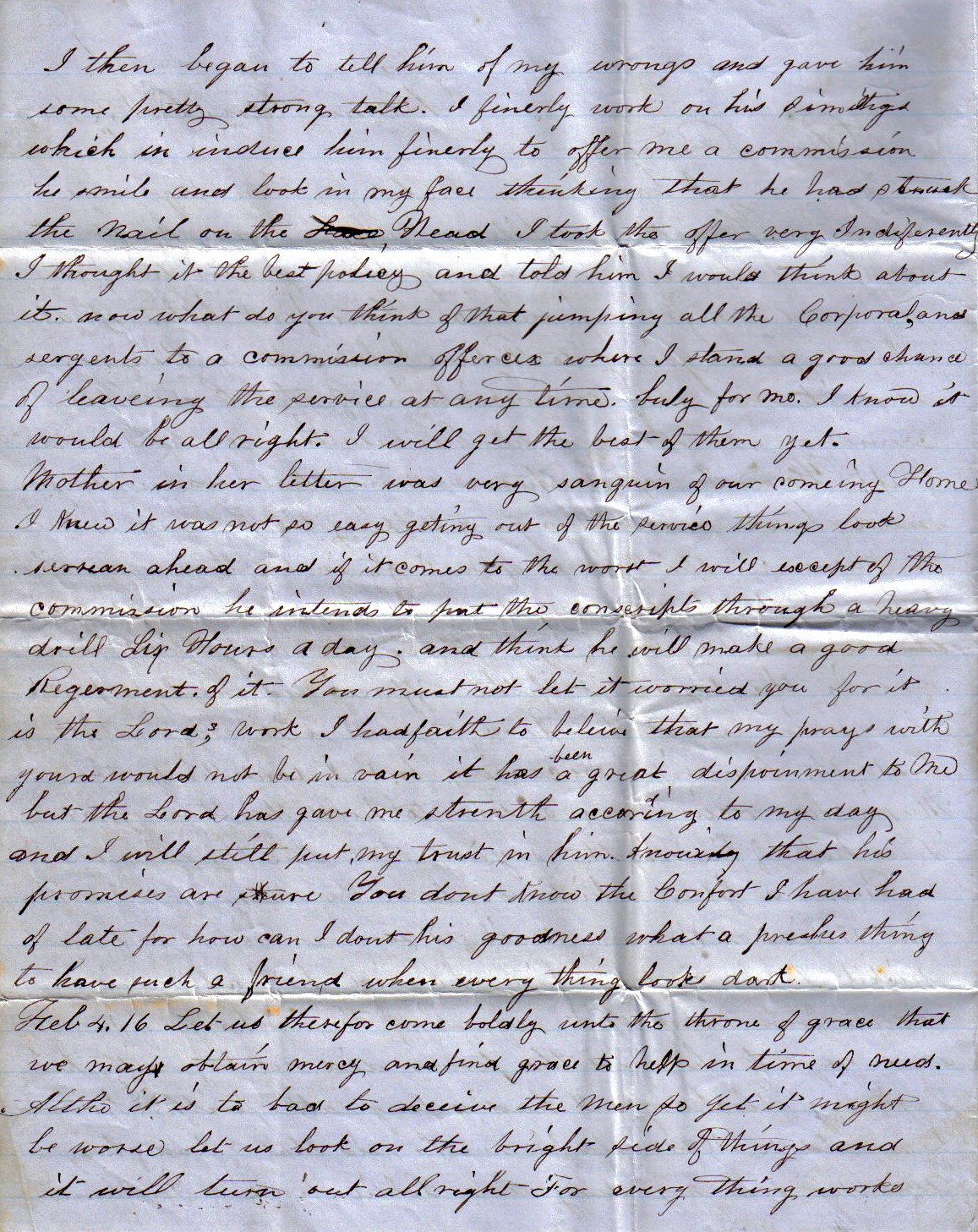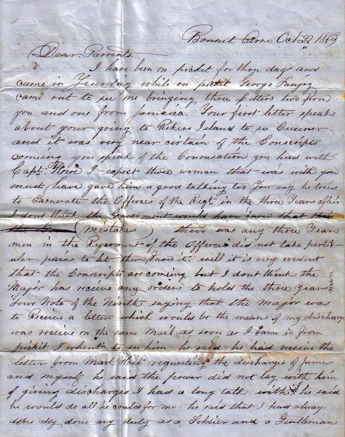 I have been on picket for three days and came in yesterday. While on picket George Fanjoy came out to see me, bringing three letters, two from you and one from Jamaica. Your first letter speaks of your going to Riker’s Island to see Curner and it was very near certain of the conscripts coming. You speak of the conversation you had with Capt. Howe. I expect that those women that were with you must have given him a good talking to. You say he tries to exonerate the officers of the Regiment in the three-year affair. I don’t think the government would have known that there were any three-year men in the Regiment if the officers did not take particular pains to let them know it. Well, it is very evident that the conscripts are coming but I don’t think the Major has received any orders to hold the three-year men. Your note of the Ninth saying the Major was to receive a letter which would be the means of my discharge was received on the same mail as soon as I came in from picket. I went to see him. He said he had received the letter from Mark Hoit requesting the discharges of James and myself. He said the power did not lay with him of giving discharges. I had a long talk with him. He said he would do all he could for me. He said I had always done my duty as a soldier and a gentleman. I then began to tell him of my wrongs and gave him some pretty strong talk. I finally worked on his sympathies which induced him finally to offer me a commission. He smiled and looked in my face thinking he had struck the nail on the head. I took the offer very indifferently. I thought it the best policy and told him I would think about it. Now what do you think of that – jumping all the corporals and sergeants – to be a commissioned officer when I stand a good chance of leaving the service at any time? Bully for me! I know it would be all right. I will get the best of them yet. Mother in her letter was very sanguine about our coming home. I knew it was not so easy getting out of the service. Things look certain ahead and if it comes to the worst I will accept the commission. He intends to put the conscripts through a heavy drill of six