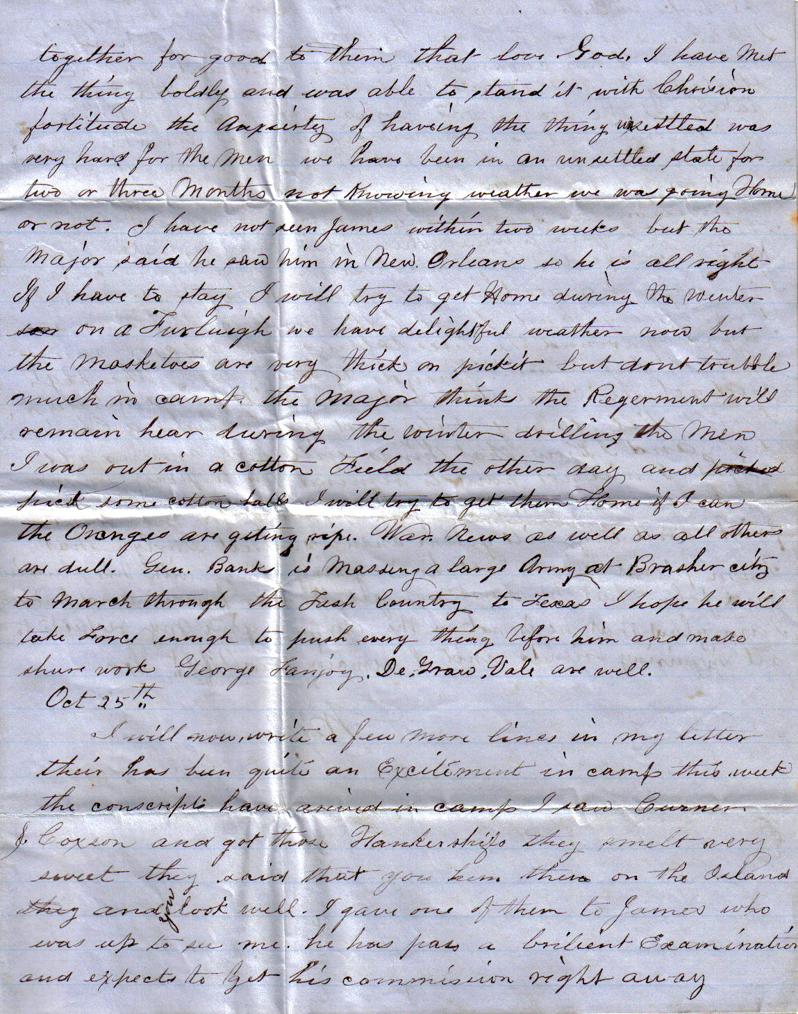 hours a day and thinks he will make a good Regiment of it. You must not let it worry you for it is the Lord’s work. I had faith to believe that my prayers with you would not be in vain. It has been a great disappointment to me but the Lord has given me strength according to my day and I will still put my trust in him, knowing that his promises are sure. You don’t know the comfort I have had of late, for how can I doubt his goodness? What a precious thing to have such a friend when everything looks dark. Heb. 4.16. Let us therefore come boldly unto the throne of grace that we may obtain mercy and find grace to help in time of need. Although it is bad to deceive the men so, yet it might be worse. Let us look on the bright side of things and it will turn out all right – For everything works together for good to them that love God. I have met the thing boldly and was able to stand it with Christian fortitude. The anxiety of having the thing unsettled was very hard for the men. We have been in an unsettled state for two or three months not knowing whether we were going home or not. I have not seen James within two weeks but the Major said he saw him in New Orleans so he is all right. If I have to stay I will try to get home in the winter on a furlough. We have delightful weather now but the mosquitoes are very thick on picket but don’t trouble much in camp. The Major thinks the Regiment will remain here during the winter drilling the men. I was out in a cotton field the other day and picked some cotton balls. I will try to get them home if I can. The oranges are getting ripe. War news as well as all others are dull. Gen. Banks is massing a large army at Brashear City to march through the Fash country to Texas. I hope he will take force enough to push everything before him and make sure work. George Fanjoy, DeGraw, and Vale are well.