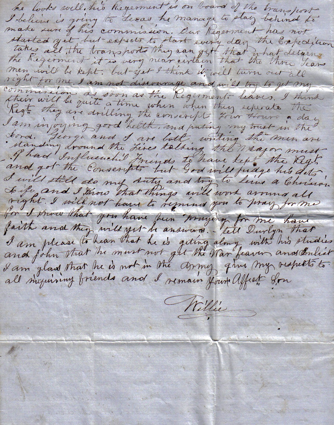 I will now write a few more lines in my letter. There has been quite an excitement in camp this week. The conscripts have arrived in camp. I saw Curner & Coxson and got those handkerchiefs. They smelled very sweet. They said that you’d been there on the Island and you look well. I gave one of them to James who was up to see me. He has passed a brilliant examination and expects to get his commission right away. He looks well. His Regiment is on board the transport. I believe he is going to Texas. He managed to stay behind to make sure of his commission. Our Regiment has not started yet but expects to start any day. The expedition takes all the transports they can get. That’s what detains the Regiment. It is very near certain that the three-year men will be kept, but yet I think it will turn out all right for me. I am not discouraged and will try to get my commission as soon as the Regiment leaves. I think there will be quite a time when they separate the Regt. They are drilling the conscripts four hours a day. I am enjoying good health and putting my trust in the Lord. George and I are both writing. The men are standing around the fires talking. The Major must have had influential friends to have kept the Regt and gotten the conscripts but God will judge his acts. I will still do my duty and try to live a Christian life and I know things will work around all right. I will not have to remind you to pray for me for I know that you have been praying for me. Have faith and they will yet be answered. Tell Durlyn that I am pleased that he is getting along with his studies and John that he must not get the War Fever and enlist. I am glad that he is not in the army. Give my respects to all inquiring friends and I remain your affectionate son,
