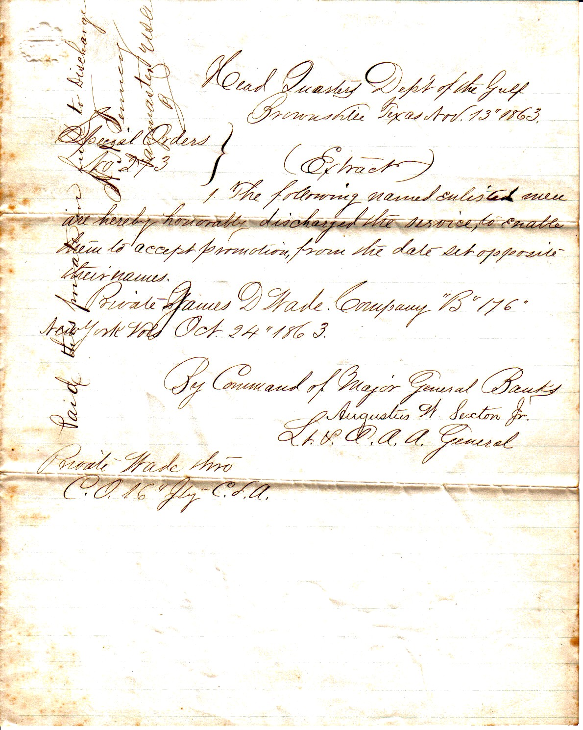 Private James D. Wade. Company “B” 176th New York Vols. Oct. 24th 1863.