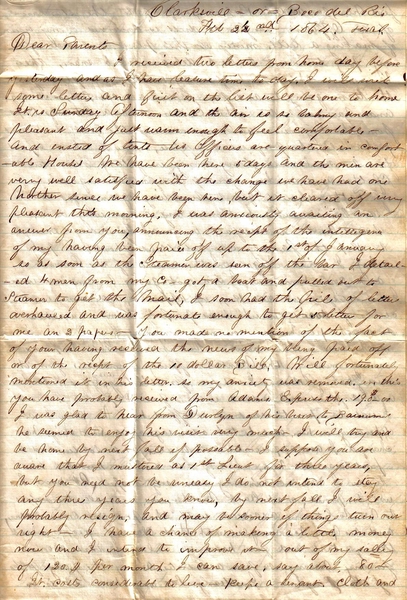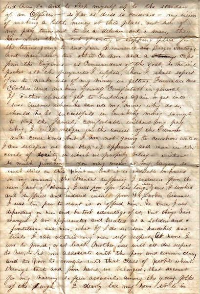 I received two letters from home, day before yesterday, and as I have leisure time today, I will write some letters and first on the list will be one to home. It is Sunday afternoon and the air is so balmy and pleasant and just warm enough to feel comfortable; and instead of tents, us Officers, are quartered in comfortable houses. We have been here 5 days and the men are very well satisfied with the change. We have had one Norther since we have been here, but it cleaned off very pleasant this morning. I was anxiously awaiting an answer from you, announcing the receipt of the intelligence of my having been paid off up to the 1st of January, so as soon as the Steamer was seen off the bar I detailed 4 men from my Company, got about and pulled out to the Steamer to get the mail. I soon had the pile of letters overhauled and was fortunate enough to get 5 letters for me and 3 papers. You made no mention of the fact of your having received the news of my being paid off or the receipt of the 10 dollar bill. Will fortunately mentioned it in his letter so my anxiety was removed, and this you probably have received from Adams Express the $190.00. I was glad to hear from Durlyn of his visit to Barnum’s. He seemed to enjoy his visit very much. I will try and be home by next fall if possible. I suppose you are aware that I mustered as 1st Lieutenant for 3 years, but you need not be uneasy; I do not intend to stay any 3 years you know. By next fall I will probably resign and may be sooner if things turn out right. I have a chance of making a little money now and I intend to improve it. Out of my salary of $120.00 per month I can save, say about, $80.00. It costs considerable to leave, keep a servant, cloth and feed him and to keep myself up to the standard of an Officer. So far as drill is concerned, my vision of making a little money at this place, outside of my pay, turns out to be a delusion and a snare. They have made this a sort of entry or stopping place for the teams going to and from Brownsville, Brajos Santiago and have sent two other Company here and a Captain from the Engineers as Commandant of the Post so he will pocket all the requisite I suppose. Now I shall expect you to make use of my money in getting furniture and clothes and making yourself comfortable in general. If Father should get to building again, or get into some business when he can use my money, why do so. Should he be successful in making money enough to keep the family comfortable without my pay, why, I will resign in the course of the Summer and come home, but I am not going to come home until I am satisfied we can keep up appearances and move in the circle of society in which we properly belong. Without so much pinching, you may wonder at my laying so much stress on this point, but it is indelibly impressed on my memory. The mental suffering I endured from the mere fact of knowing I was poor for six long weary years. I worked and suffered and endured insult from Dr. Barker because I was too poor to resent it or offend him. He knew I was depending on him and he took advantage of it. But things have changed; I am appreciated and treated as a soldier and a gentleman out here. What if I do see some hardship and trials, I can retain my own self respect. At home I was to prove, or at least Mother was, with all due respect to her, to let me associate with the poor and common class, and too poor to mingle with that class of people which through taste and from habit we belonged. That account for having so few associates among the young folks of the Burgh. I dearly love my home, it is in my thoughts by day and in my dreams at night and I look forward, hopefully and with much joy, to the time when I can once more walk the Street of my own, my own Nation City. I can appreciate the feeling of John because I have been there; the treatment of the Dr. is calculated to depress the manly and independent sentiments of a young man, I hardly know how to advise him. At any rate, he can now afford to assume a more independent attitude with regard to the Dr. From what I know of the Dr., he will treat John a great deal better if John gets him to understand that he is wholly independent of him. Rather than John leave him, he will treat him better I believe. I am glad John is practicing with the dumbbells, he ought to learn the manly art of self-defense (boxing), which I am. I can learn Will several new points about countering with the left, making terse lunges with the right,