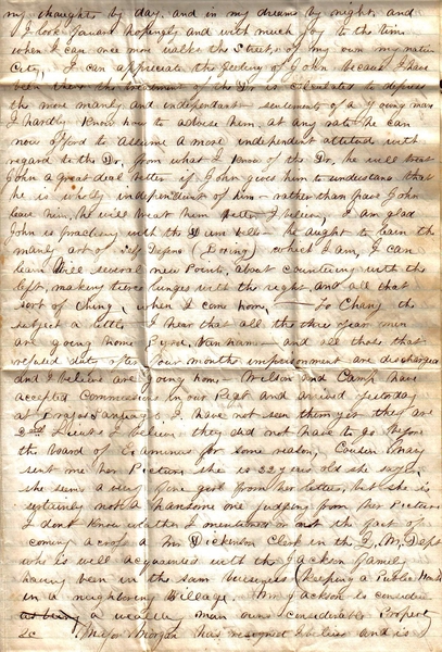 and all that sort of thing when I come home. To change the subject a little, I hear that all the three-year men are going home, Byrd, Van Namm and all those that refused duty after four months imprisonment are discharged and I believe are going home. Wilson and Camp have accepted Commissions in our Regiment and arrived yesterday at Brazos Santiago. I have not seen them yet, they are 2nd Lieutenants. I believe they did not have to go before the board of Examiners for some season. Cousin May sent me her pictures; she is 22 years old she says. She seems a very fine girl from her letters, but she is certainly not a handsome one judging from her pictures. I don’t know whether I mentioned or not the fact of coming across a Mr. Dickenson, a clerk in the L.M. Department, who is well acquainted with the Jackson family, having been in the same business (keeping a public house) in a neighboring village. Mr. Jackson is considered a wealthy man, owns considerable property. Major Morgan has resigned I believe, and is now in charge of some Government Plantation on the Plaquemine somewhere. The 176th is stationed in Madisonville near Lake Ponchetrain, somewhere they are to form part of the forces in the attack of Mobile. There is nothing particular going on about here; there being nothing else to do, there being no chance for any rowboat exercise, I am teaching some of the men to read. I have commenced with my non-commissioned Officers, 9 of them. They are very anxious to learn, and they are in all different states of learning. Two of them having got as far as ba-ker la-dy etc., some learning their ABCs and other spelling go-fo-ho-no-le. They are not very apt scholars but awful persevering, they keep it up right, straight along and th ink it a big thing if they learn to spell 2 or 5 words in one lesson. They are about the most thick-headed crowd I ever did come across, t hey are very superstitious too. When I laughed at the idea of the Devil appearing in bodily shape in this world, they could not seem to conjure the possibility of my not believing it, they spoke up, “’scuse me Captain, but I have seed wid my own eyes, yer can’t fool dis yer chile, I k now de debble when I seed him, seed him offen.” I am very comfortable now quartered in a large house with nothing particular to do and plenty of time to do it in. I am going to send to New Orleans for books and improve my time reading, no one knows though how long it is going to last perhaps all summer and may be only a short time, everything is so uncertain. You advise me not to follow in the ways of the Mexicans. I hardly know what you mean but I certainly shall not follow them much. 1st,, because they are very dirty and wear too much hat. 2nd, I can’t speak the language and it smells too nasty in their huts. Even my servant treats them with contempt and drives them out of the cook house where they hang around.