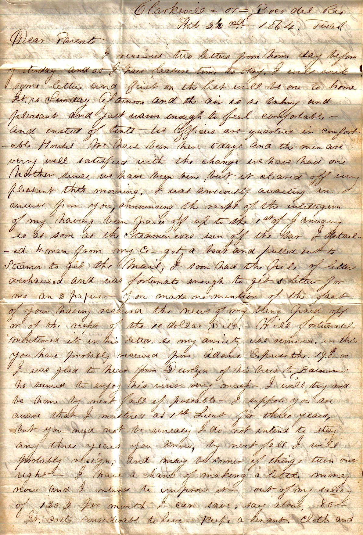 I received two letters from home, day before yesterday, and as I have leisure time today, I will write some letters and first on the list will be one to home. It is Sunday afternoon and the air is so balmy and pleasant and just warm enough to feel comfortable; and instead of tents, us Officers, are quartered in comfortable houses. We have been here 5 days and the men are very well satisfied with the change. We have had one Norther since we have been here, but it cleaned off very pleasant this morning. I was anxiously awaiting an answer from you, announcing the receipt of the intelligence of my having been paid off up to the 1st of January, so as soon as the Steamer was seen off the bar I detailed 4 men from my Company, got about and pulled out to the Steamer to get the mail. I soon had the pile of letters overhauled and was fortunate enough to get 5 letters for me and 3 papers. You made no mention of the fact of your having received the news of my being paid off or the receipt of the 10 dollar bill. Will fortunately mentioned it in his letter so my anxiety was removed, and this you probably have received from Adams Express the $190.00. I was glad to hear from Durlyn of his visit to Barnum’s. He seemed to enjoy his visit very much. I will try and be home by next fall if possible. I suppose you are aware that I mustered as 1st Lieutenant for 3 years, but you need not be uneasy; I do not intend to stay any 3 years you know. By next fall I will probably resign and may be sooner if things turn out right. I have a chance of making a little money now and I intend to improve it. Out of my salary of $120.00 per month I can save, say about, $80.00. It costs considerable to leave, keep a servant, cloth and feed him and to keep myself up to the standard of an Officer. So far as drill is concerned, my vision of making a little money at this place, outside of my pay, turns out to be a delusion and a snare. They have made this a sort of entry or stopping place for the teams going to and from Brownsville, Brajos Santiago and have sent two other Company here and a Captain from the Engineers as Commandant of the Post so he will pocket all the requisite I suppose. Now I shall expect you to make use of my money in getting furniture and clothes and making yourself comfortable in general. If Father should get to building again, or get into some business when he can use my money, why do so. Should he be successful in making money enough to keep the family comfortable without my pay, why, I will resign in the course of the Summer and come home, but I am not going to come home until I am satisfied we can keep up appearances and move in the circle of society in which we properly belong. Without so much pinching, you may wonder at my laying so much stress on this point, but it is indelibly impressed on my memory. The mental suffering I endured from the mere fact of knowing I was poor for six long weary years. I worked and suffered and endured insult from Dr. Barker because I was too poor to resent it or offend him. He knew I was depending on him and he took advantage of it. But things have changed; I am appreciated and treated as a soldier and a gentleman out here. What if I do see some hardship and trials, I can retain my own self respect. At home I was to prove, or at least Mother was, with all due respect to her, to let me associate with the poor and common class, and too poor to mingle with that class of people which through taste and from habit we belonged. That account for having so few associates among the young folks of the Burgh. I dearly love my home, it is in my thoughts by day and in my dreams at night and I look forward, hopefully and with much joy, to the time when I can once more walk the Street of my own, my own Nation City. I can appreciate the feeling of John because I have been there; the treatment of the Dr. is calculated to depress the manly and independent sentiments of a young man, I hardly know how to advise him. At any rate, he can now afford to assume a more independent attitude with regard to the Dr. From what I know of the Dr., he will treat John a great deal better if John gets him to understand that he is wholly independent of him. Rather than John leave him, he will treat him better I believe. I am glad John is practicing with the dumbbells, he ought to learn the manly art of self-defense (boxing), which I am. I can learn Will several new points about countering with the left, making terse lunges with the right,