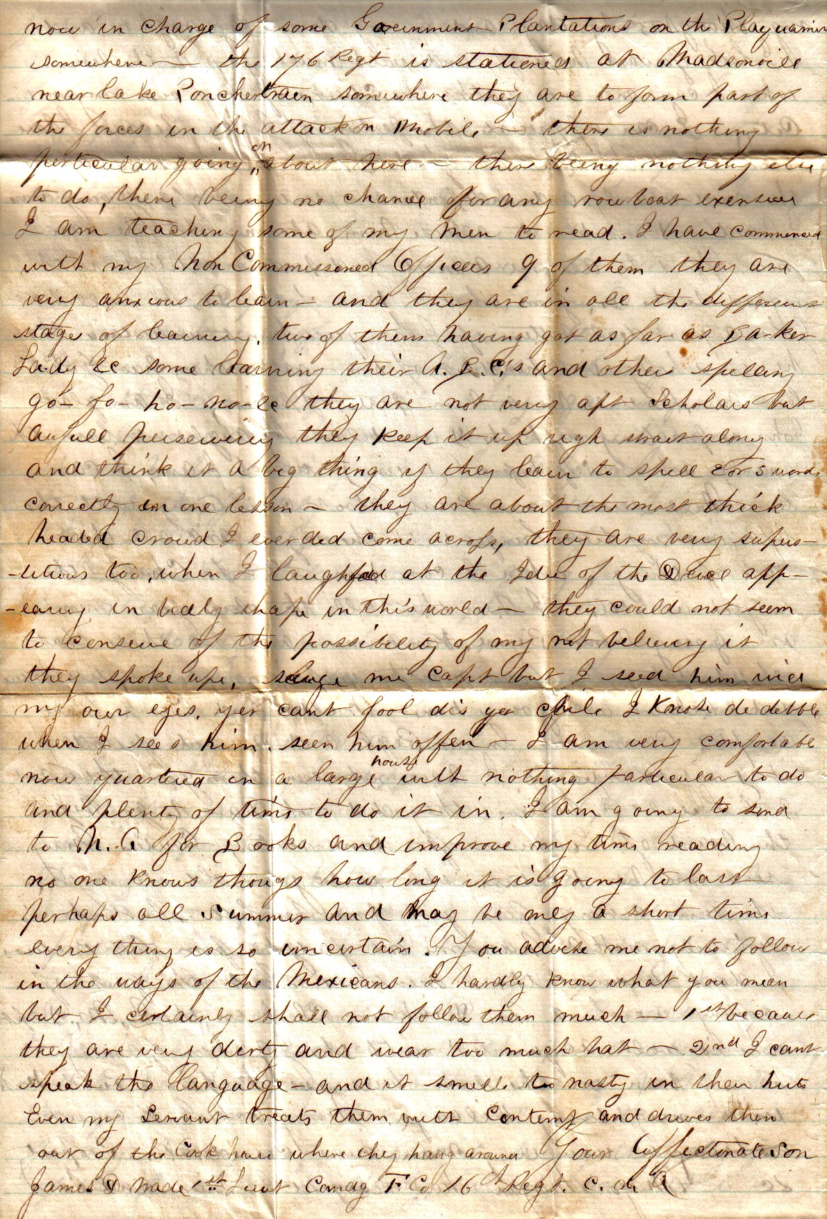 and all that sort of thing when I come home. To change the subject a little, I hear that all the three-year men are going home, Byrd, Van Namm and all those that refused duty after four months imprisonment are discharged and I believe are going home. Wilson and Camp have accepted Commissions in our Regiment and arrived yesterday at Brazos Santiago. I have not seen them yet, they are 2nd Lieutenants. I believe they did not have to go before the board of Examiners for some season. Cousin May sent me her pictures; she is 22 years old she says. She seems a very fine girl from her letters, but she is certainly not a handsome one judging from her pictures. I don’t know whether I mentioned or not the fact of coming across a Mr. Dickenson, a clerk in the L.M. Department, who is well acquainted with the Jackson family, having been in the same business (keeping a public house) in a neighboring village. Mr. Jackson is considered a wealthy man, owns considerable property. Major Morgan has resigned I believe, and is now in charge of some Government Plantation on the Plaquemine somewhere. The 176th is stationed in Madisonville near Lake Ponchetrain, somewhere they are to form part of the forces in the attack of Mobile. There is nothing particular going on about here; there being nothing else to do, there being no chance for any rowboat exercise, I am teaching some of the men to read. I have commenced with my non-commissioned Officers, 9 of them. They are very anxious to learn, and they are in all different states of learning. Two of them having got as far as ba-ker la-dy etc., some learning their ABCs and other spelling go-fo-ho-no-le. They are not very apt scholars but awful persevering, they keep it up right, straight along and th ink it a big thing if they learn to spell 2 or 5 words in one lesson. They are about the most thick-headed crowd I ever did come across, t hey are very superstitious too. When I laughed at the idea of the Devil appearing in bodily shape in this world, they could not seem to conjure the possibility of my not believing it, they spoke up, “’scuse me Captain, but I have seed wid my own eyes, yer can’t fool dis yer chile, I k now de debble when I seed him, seed him offen.” I am very comfortable now quartered in a large house with nothing particular to do and plenty of time to do it in. I am going to send to New Orleans for books and improve my time reading, no one knows though how long it is going to last perhaps all summer and may be only a short time, everything is so uncertain. You advise me not to follow in the ways of the Mexicans. I hardly know what you mean but I certainly shall not follow them much. 1st,, because they are very dirty and wear too much hat. 2nd, I can’t speak the language and it smells too nasty in their huts. Even my servant treats them with contempt and drives them out of the cook house where they hang around.
