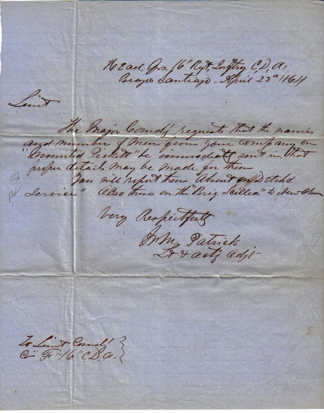 The Major Comd’g requests that the names and number of men from your company on “Mounted Pickett” be immediately sent in, that proper details may be made for them.