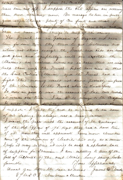 The French are in possession of Bagdad and have been for some time; they tried to get Matamoras but were not strong enough. The French and Rebels are hand and glove and sympathize with one another. The Mexicans are inclined toward us in hopes that we will help them whelp the French. Reports have come in that the General Contina (Mexican) and the French had a fight this morning, result not known. It is probably in favor of the Mexicans, as the French were in small force.