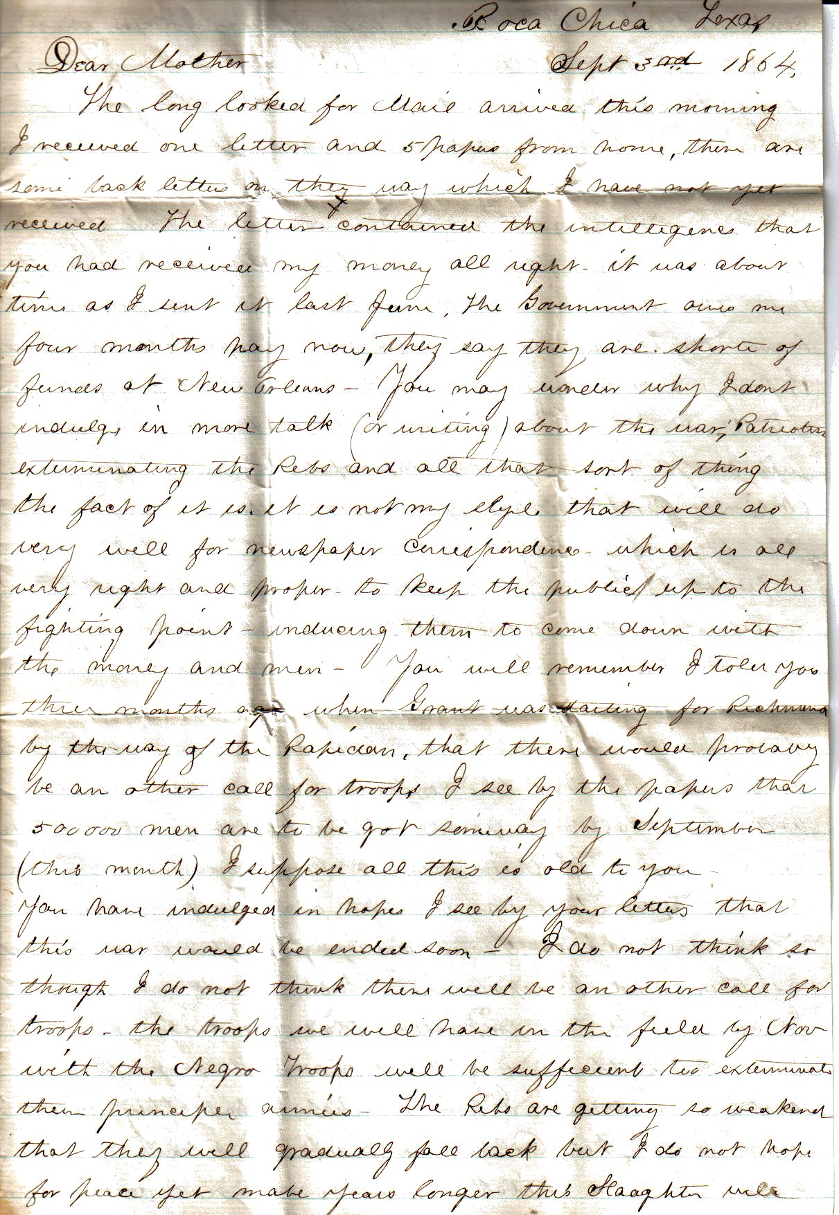 The long looked for mail arrived this morning; I received one letter and five papers from home. There are some back letters on the way which I have not yet received. The letters contained the intelligence that you had received my money all right; it was about time as I sent it last June. The Government owes me four months pay now, they say they are short of funds at New Orleans. You may wonder why I don’t indulge in more talk (or writing) about the war; Patriots exterminating the Rebs and all that sort of thing. The fact of it is, it is not my style; that will do very well for newspaper correspondence, which is all right and proper to keep the public up to the fighting point, inducing them to come down with the money and men. You will remember I told you three months ago when Grant was taking for Richmond by the way of the Rapidan, that there would probably be another call for troops. I see by the papers that 500,000 men are to be got someway by September (this month). I suppose all this is old to you, you have indulged in hopes I see by your letters that this war will be ended soon. I do not think so though I do not think there will be another call for troops; the troops we will have in the field by November that they will gradually fall back but I do not hope for peace, yet maybe years longer this slaughter continues. What is the earnest wish of every soldier that I have spoken with, is that the U.S. may recruit or draft every Black man suitable for a soldier. They want more drill to make soldiers of them than White men do, but the great problem has been solved; they will make not as good as White men perhaps, but they will do. I am much pleased to se that they are forcing them into the army in all directions; give them six months hard drill, say about six hours a day, except Saturday and Sunday, and they will be ready in the Spring to run over the South. I received Will’s package of tea; it was just enough for tea for our mess of three, and I also got Will circular, it is got up in good taste. I am glad that the boys are getting along in the Store and I am in hopes that Father will keep his health. I suppose his business is dull now,