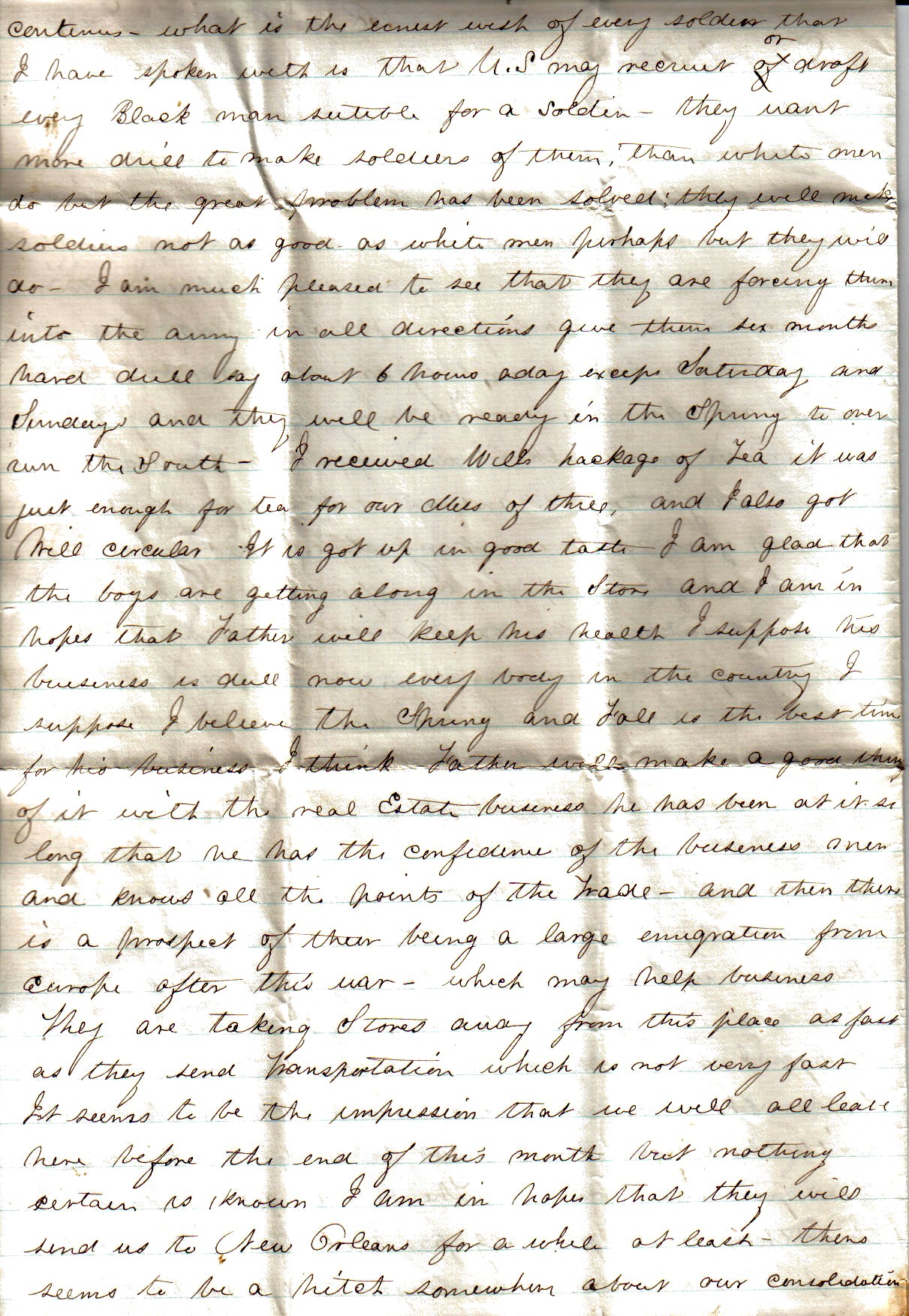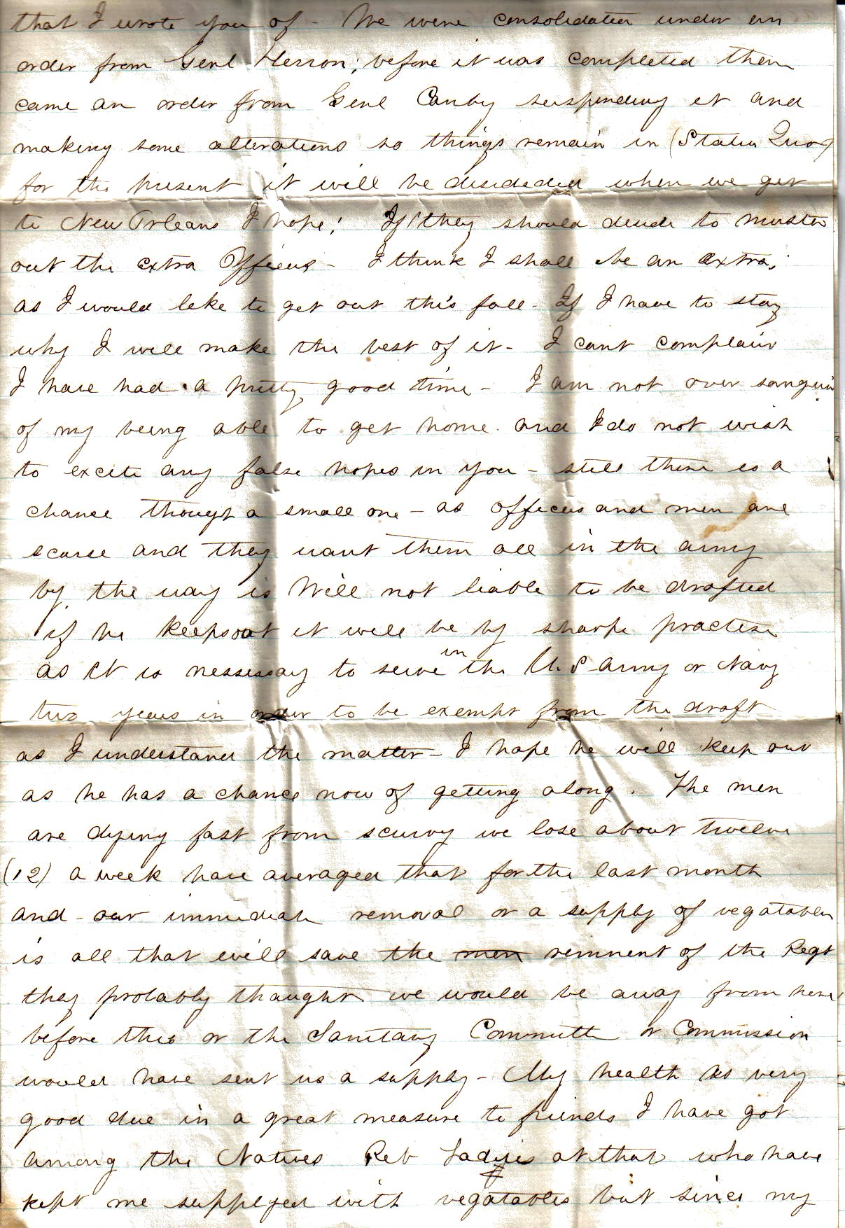 everybody in the country I suppose; I believe the Spring and Fall are the best times for his business. I think Father will make a good thing of it with the real estate business he has been at it so long that he has the confidence of the business men and knows all the points of the trade. And then in the prospect of them being a large emigration from Europe after this war, which may help business, they are taking stores away from this place as fast as they send transportation, which is not very fast. It seems to be the impression that we will all leave here before the end of this month but nothing certain is known. I am in hopes that they will send us to New Orleans for a while at least. There seems to be a hitch somewhere about our consolidation that I wrote you of. We were consolidating under an order from General Herron; before it was completed, then came an order from General Conby suspending it and making some alterations. So things remain in “Status quo” at present, it will be decided when we get to New Orleans I hope. If they should decide to muster out the extra Officers, I think I should be an extra, as I would like to get out this fall. If I have to stay I will make the best of it. I cannot complain, I have had a pretty good time. I am not over sanguine of my being able to get home and I do not wish to excite any false hopes in you; still there is a chance, though a small one, as officers and men are scarce and they want them all in the army. By the way, is Will not liable to be drafted if he keeps out, it will be by sharp practice as it is necessary to serve in the U.S. Army or Navy two years in order to be exempt from the draft, as I understand the matter. I hope he will keep out as he has a chance now of getting along. The men are dying fast from scurvy, we lose about twelve a week, have averaged that for the last month and our immediate removal or a supply of vegetation is all that will save the men remnant of the Regiment. They probably thought we would be away from here before then or the Sanitary Committee or Commission would have sent us a supply. My health is very good due in great measure to friends I have got among the Native Rebel Ladies at that who have kept me supplied with vegetables, but since my escape some time since the Calvary, my communication has been cut off. I suppose the Rebel Officers are receiving their kind attentions now. We manage to live in pretty good style though, plenty of can fruits and meats if you are in mind to pay for them; one dollar a can and then we have other things to keep off the scurvy.