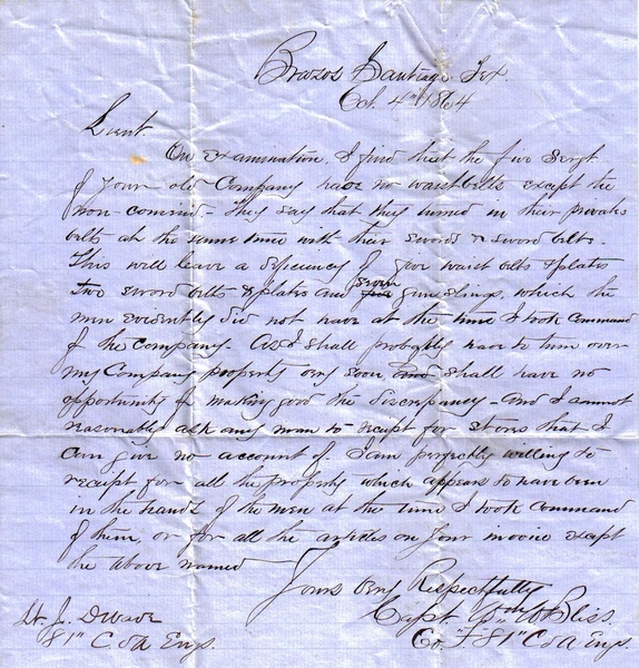 On examination, I find that the five sergeants of your old Company have no waist belts except the non-commissioned. – They say that they turned in their private belts – at the same time with their swords & sword belts. This will leave a deficiency of five waist belts & plates, two sword belts & plates, and seven gun slings, which the men evidently did not have at the time I took command of the company. As I shall probably have to turn over my Company property very soon, I shall have no opportunity of making good the discrepancy – and I cannot reasonably ask any man to receipt for stores that I can give no account of. I am perfectly willing to receipt for all the property which appears to have been in the hands of the men at the time I took command of them, or for all the articles on your invoice except the above named.