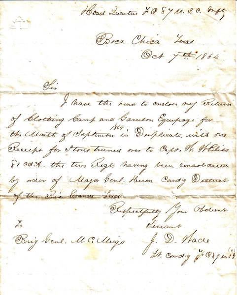 I have the honor to enclose my return of clothing, camp, and garrison equipage for the month of September 1864 in duplicate with one receipt for stores turned over to Capt. W.W. Bliss, 81 C.d.A., the two Regiments having been consolidated by order of Major Genl. Herron, Comd’g District of the Rio Grande, Texas.