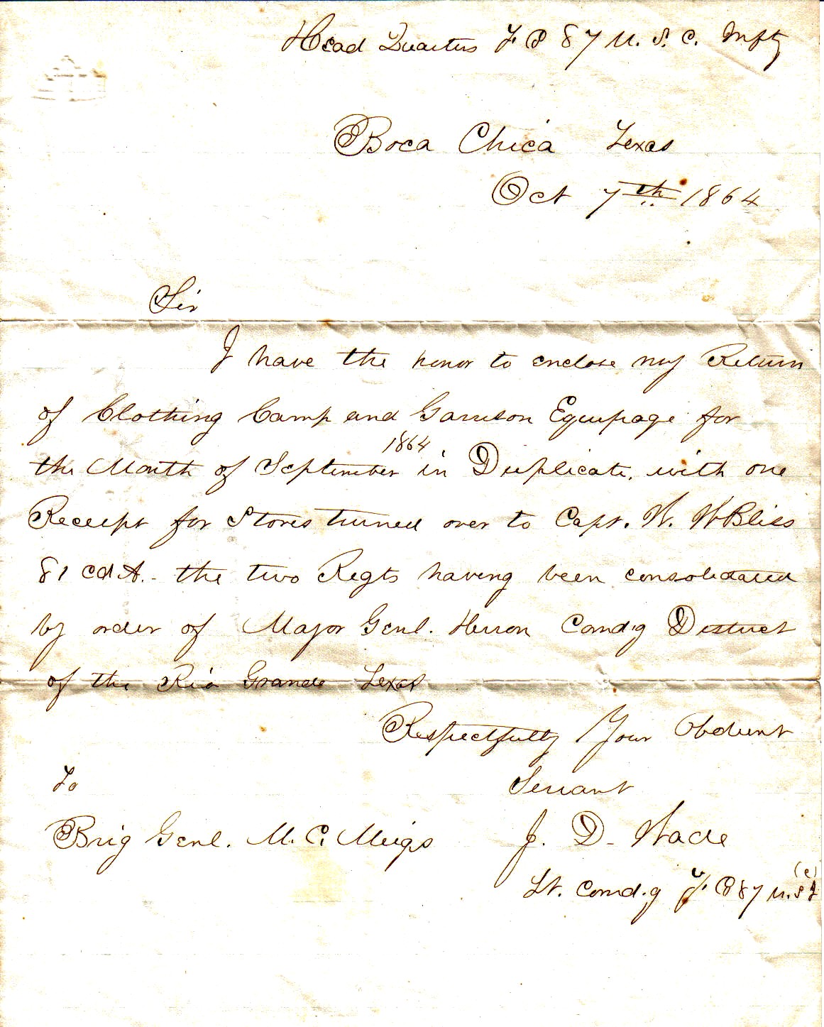 I have the honor to enclose my return of clothing, camp, and garrison equipage for the month of September 1864 in duplicate with one receipt for stores turned over to Capt. W.W. Bliss, 81 C.d.A., the two Regiments having been consolidated by order of Major Genl. Herron, Comd’g District of the Rio Grande, Texas.